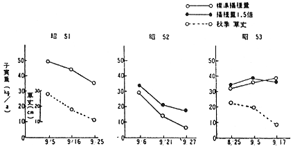 ②秋播コムギ:ア、当長期積雪地帯では播種期が遅れると冬損が多発し減収する。(冬損の多発が輪作作物としての導入の阻害要因) イ、「ホロシリコムギ」の播種期は9月上旬が適期、中旬播では播種量1.5倍で穂数が確保され、収量回復(昭和52年度、標準の47%から78%に増加)がみられる。9月下旬播では冬損の多発及び生育量が劣って、播種量増による収量回復は困難である。