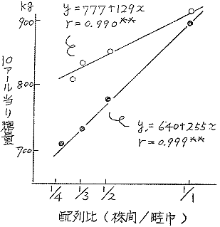 (4)以上のことから配列比(畦巾距離に対する株間距離の比)を1/1に近づけること、即ち畦巾を狭め、株間を広げ可能なかぎり正方形植えに近づけることによって根重、糖量は高まり、とくに疎植の場合にその効果は顕著である。