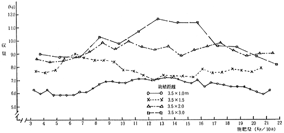 ②施肥量については,9〜15Kg程度の施肥範囲でやや収量が高く,それ以上の施肥量では増加はみられなかった。