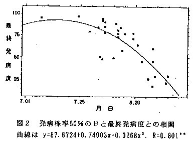(6)発病株率50%に達した日と最終発病度(9/30)では高い相関があった(図2)。9月1日以降に株率50%に達した場合は最終発病度が30を越えなかった。