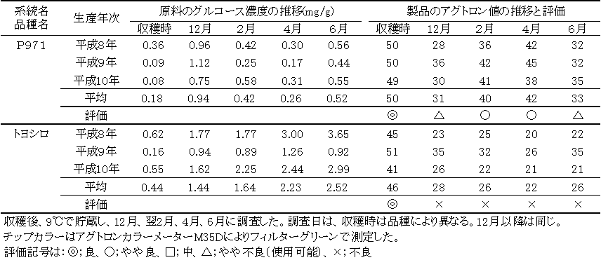 油加工用の代表として利用されているポテトチップスの原料には、中早生の「トヨシロ」を中心に、早生の「ワセシロ」、中晩生の「農林1号」が用いられてきた。年間の原料供給体制は、8月中旬から翌5月中旬まで道産原料を使用し、5月下旬から8月上旬まで九州及び関東南部産の原料を使用している。貯蔵温度は萌芽、減耗、腐敗、貯蔵コスト等を考えると低温の方が好ましい。しかし、貯蔵を行う道産の「トヨシロ」と「農林1号」は、10℃以下の低温貯蔵をすると還元糖が増加しチップカラーが悪くなるため、加工前に加温処理が必要である。そこで低温で長期貯蔵ができ、原料品質と規格内率・製品歩留りの高い品種が要望されてきた。