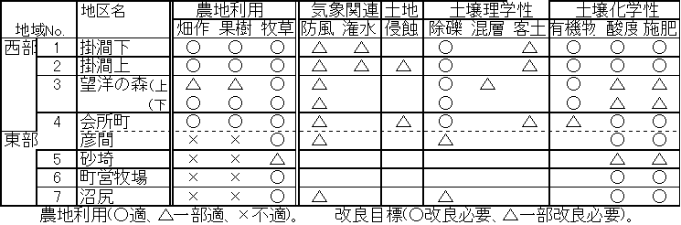 東部は草地主体の土地利用が適合する。畑作、果樹栽培には一部地域で防風対策や潅水が