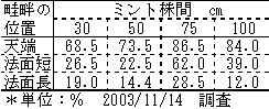表3.アップルミント畦畔の栽植間隔と定植年の草高と越冬前株当たり根長