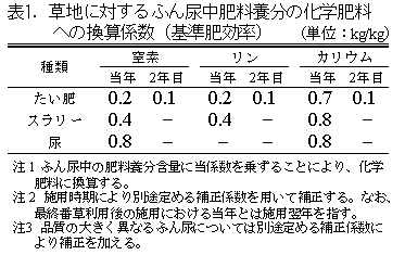 1) チモシーおよびオーチャードグラス草地では、ふん尿の肥料換算に際し、従来の基準肥効率を表1に、暫定値であったふん尿施用時期による窒素の補正係数を表2に改訂する。