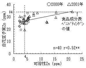 図2 作土の0.1N塩酸可溶性亜鉛と白花豆子実亜鉛の関係
