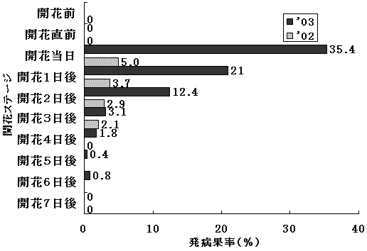 図1.接種時の開花ステージ別発病果率(幼果菌核病)
