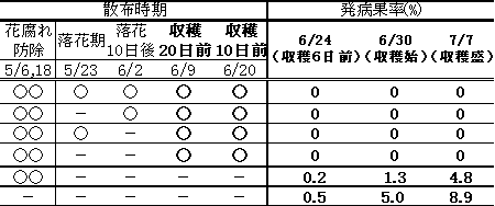 4)灰星病の重点防除時期は開花直前と満開3日後(花腐れ防除)、着色始(収穫20日前)〜収穫直前(果実腐れ防除)であり、幼果期間防除の省略が可能であった(表4)。ただし幼果期間が多湿に経過する場合はこの間も防除を徹底する。