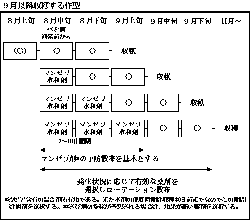 4)主要病害に対しては、収穫時期が8月までの作型では無農薬または収穫30日前を重点防除期間としたローテーション散布、9月以降の作型ではマンゼブ水和剤の予防散布を基本とした、8月中旬(べと病初発前)からのローテーション散布により減農薬栽培が可能である(図1)。
