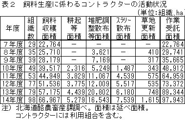 2)コントラクターは地域の酪農経営の飼料生産に対して大きな役割を担っており、今やコントラクター無くして地域の酪農生産を維持できない状況となっていることから、コントラクターの安定的発展が強く求められる(表2)。