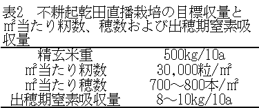 (3) 目標精玄米重500kg/10aを得るm2当たり籾数は3万粒、m2当たり穂数は700.800本/m2程度で、これを達成する出穂期の窒素吸収量は8.10kg/10a必要であった(表2)。