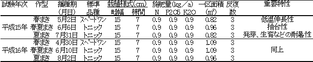 1.目 的:ほうれんそうの民間育成品種について、作型、地域適応性をふまえ、外観品質特性、収穫作業性、内分品質等を調査し、産地における品種選択の資料を提供する。