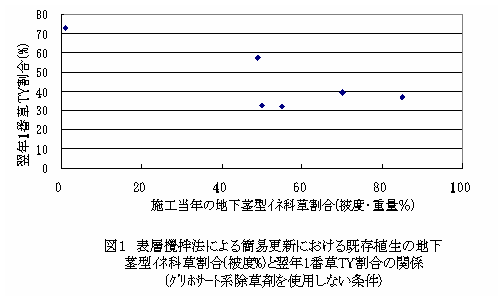 (2)表層攪拌法では、施工効果は地下茎型イネ科草割合に影響され、改善目標を翌年1番草TY割合50%とすると、地下茎型イネ科草割合がおよそ40〜50%程度以上の条件では、グリホサート系除草剤を使用することが必要になる。グリホサート系除草剤を使用した条件では、地下茎型イネ科草割合に大きく影響されることはなかった(図1,表1)。