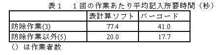 (2) 試験内容:大豆(ユキホマレ)の耕うんから収穫までの生産履歴を開発手法と慣行の表計算ソフトを利用した方法で作成する。記録項目は作物名、月日、圃場番号、作業名、作業時間、薬剤使用の場合には薬剤名とその使用量及び作業者名(慣行法のみ)である。薬剤散布作業は3人の作業者により合計6回、耕うん等の他の作業は5人の作業者により合計9回行った。慣行法では、農薬名以外はすべて選択式である。