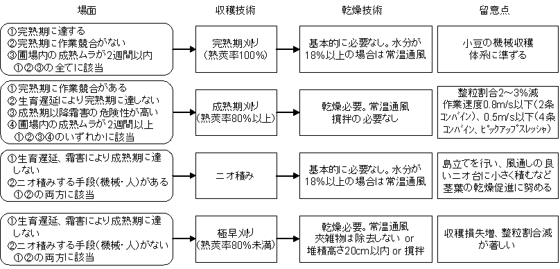 1)熟莢率80%からの機械収穫は早刈りせざるを得ない理由のある場合に適用する。