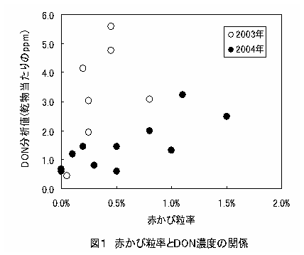 1)赤かび粒の混入が少ない試料でもDON濃度が高いものも認められることから、生麦のDON濃度を赤かび粒率から推算することは困難である。(図1)。