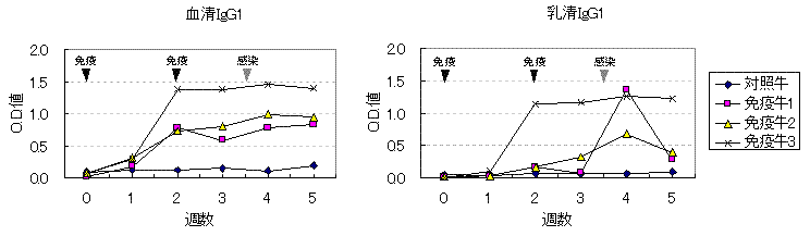 図2 mSEC免疫牛、非免疫牛における血清および乳清中のIgG1抗体価の推移