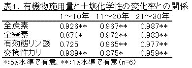 用量との間には有意な正の相関が認められ、有機物の連用による通気性や保水性の上昇、排水性の向上がうかがえた(図1)。