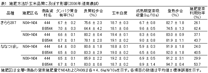 (2)側条施肥肥料BB544は444よりも施肥窒素の利用効率が高く、成熟期窒素吸収量が9kgN/10aを超える条件では登熟歩合が低下し品質が劣る場合があった。したがってBB544を使用する場合、過剰な窒素吸収を防ぐため全窒素施肥量の1割程度減肥する(表1)。