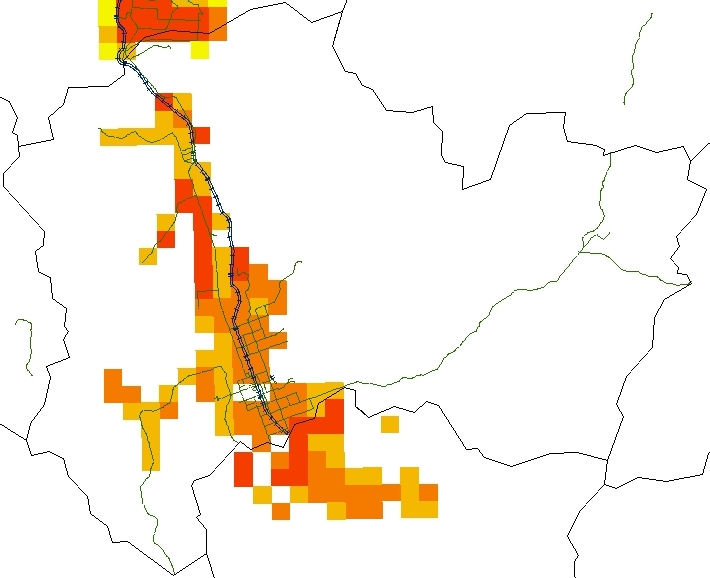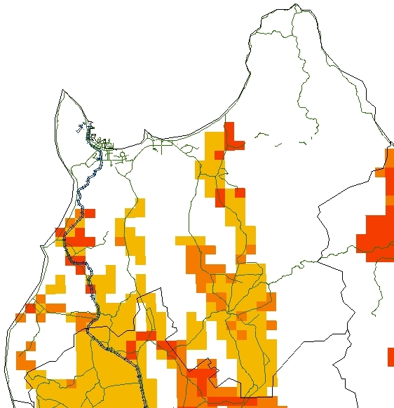 このマップは「寒地型イネ科牧草の耐干性と天北地方の干ばつリスクの試算」(平成24年指導参考事項)の試算法を用いて、天北地方全域の2番草生育期間の干ばつ日数とチモシーの干ばつリスクを算出したものです。