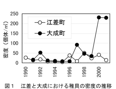1990年以降の平均稚貝密度は江差と大成でそれぞれ21、67個体/平方メートルですが、大成では2000年と2001年に200個体/平方メートルを超える密度で稚貝が出現し、江差でも1998、2000年に40個体/平方メートルを上まわる密度で稚貝がみられ(図1)、最近になってようやく稚貝の発生が比較的良好となってきました。そこで発生量に影響を及ぼすと考えられる要因のうち水温と波浪について次のように検討しました。