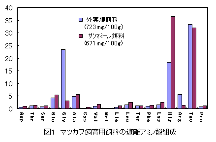 遊離アミノ酸の総量に大きな差はみられませんでしたが、外套膜飼料はタウリン(Tau)、グリシン(Gly)、ヒスチジン(His)の3種類で、サンマミール飼料はタウリンとヒスチジンの2種類で、それぞれ全体の約8割を占めていました。