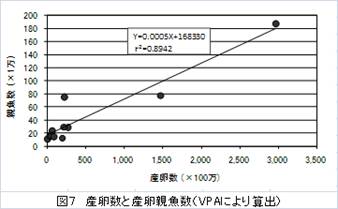 毎年の産卵数は卵の密度分布図から計算しています。また、水試で行っている漁獲物調査で把握される年齢別漁獲尾数をコホート解析(VPA)することによって資源尾数を推定することができ、産卵に寄与した親の数を推定することができます。こうして算出された産卵数と親魚数との間には正の相関が認められます(図7)。