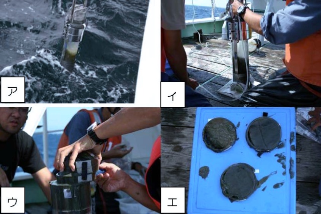 ア:海中からの採泥器引き上げ(直上水とともに表面泥が流れることなく採集できる)。イ:直上水の排水。ウ:底泥の採取(2センチメートル刻みで 3層分採取する)。エ: 0 -2センチメートル(左上)、 2 -4センチメートル(右上)、 4 -6センチメートル(下)に区分された底泥サンプル。(撮影:金星丸 須貝)