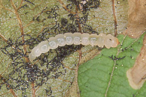シラカバノクロホシハムグリハバチ 6~8月にシラカンバの葉に潜るウジムシ(幼虫).最大長約6mm.糞は粒状.
