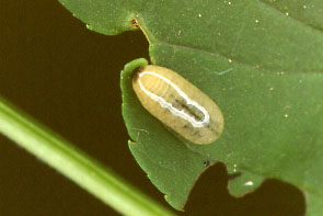 テントウノミハムシ 葉に潜るイモムシ(幼虫).最大長約5~6mm.黄白色.春から夏に発生.