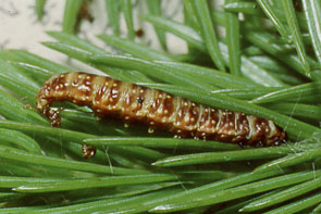 トドマツアミメヒメハマキ 最大長約12mm.体はやや太く,淡い黄色.頭部は黄色.春に新葉を糸でつづりあわせ,その内側から葉の片面だけを食べる.