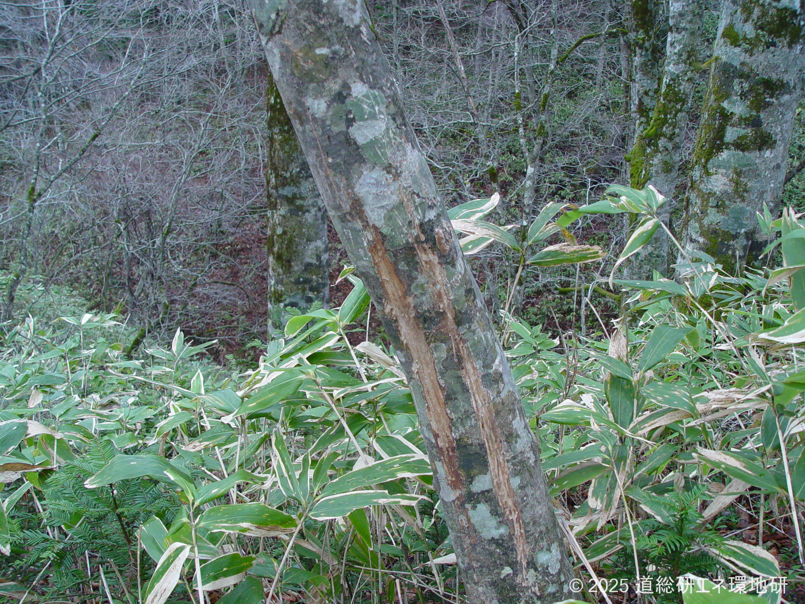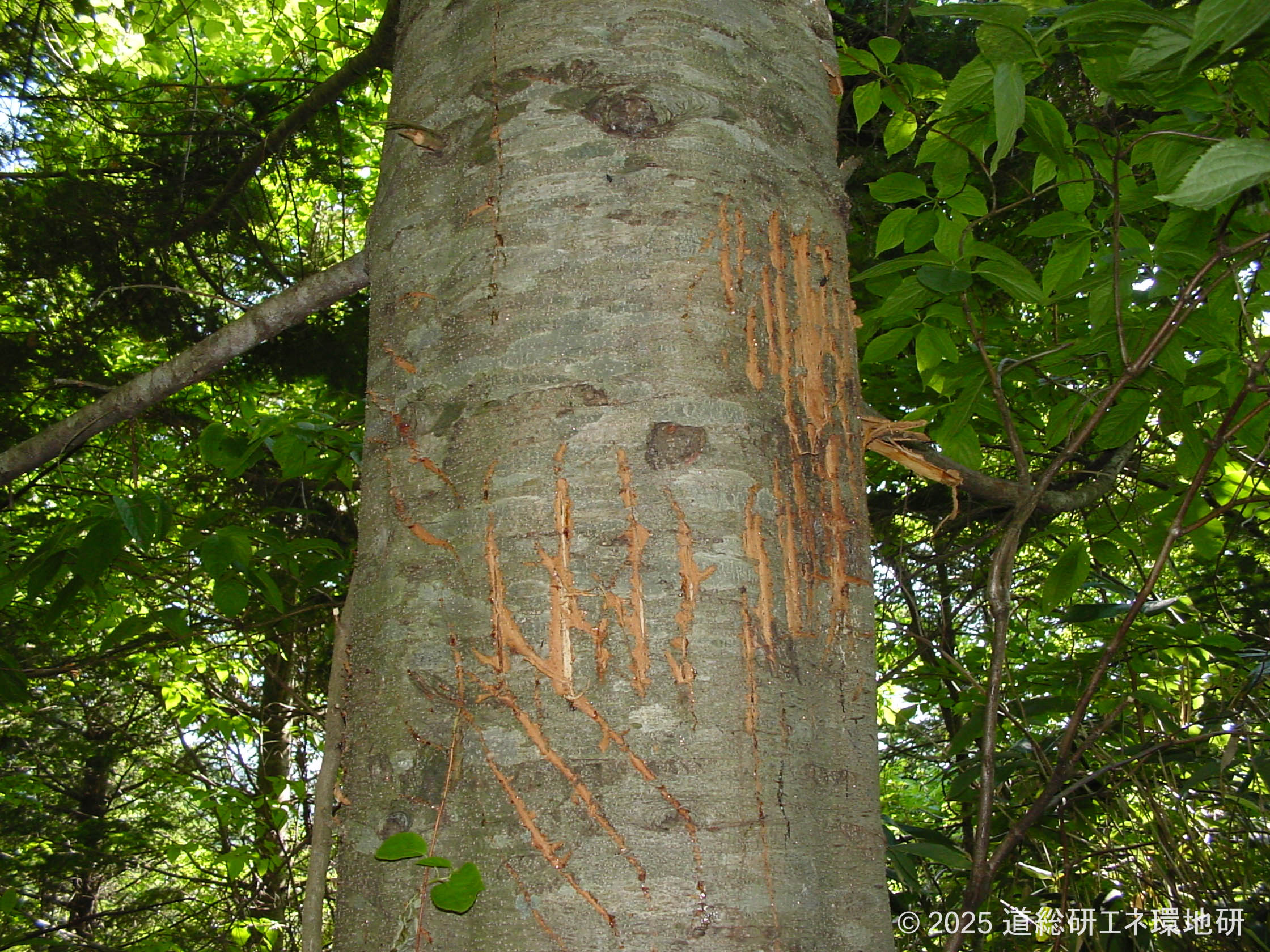 ![]() ヒグマ 冬眠穴 | ![]() ヒグマ 痕跡 爪痕1 | ![]() ヒグマ 痕跡 爪痕2 |