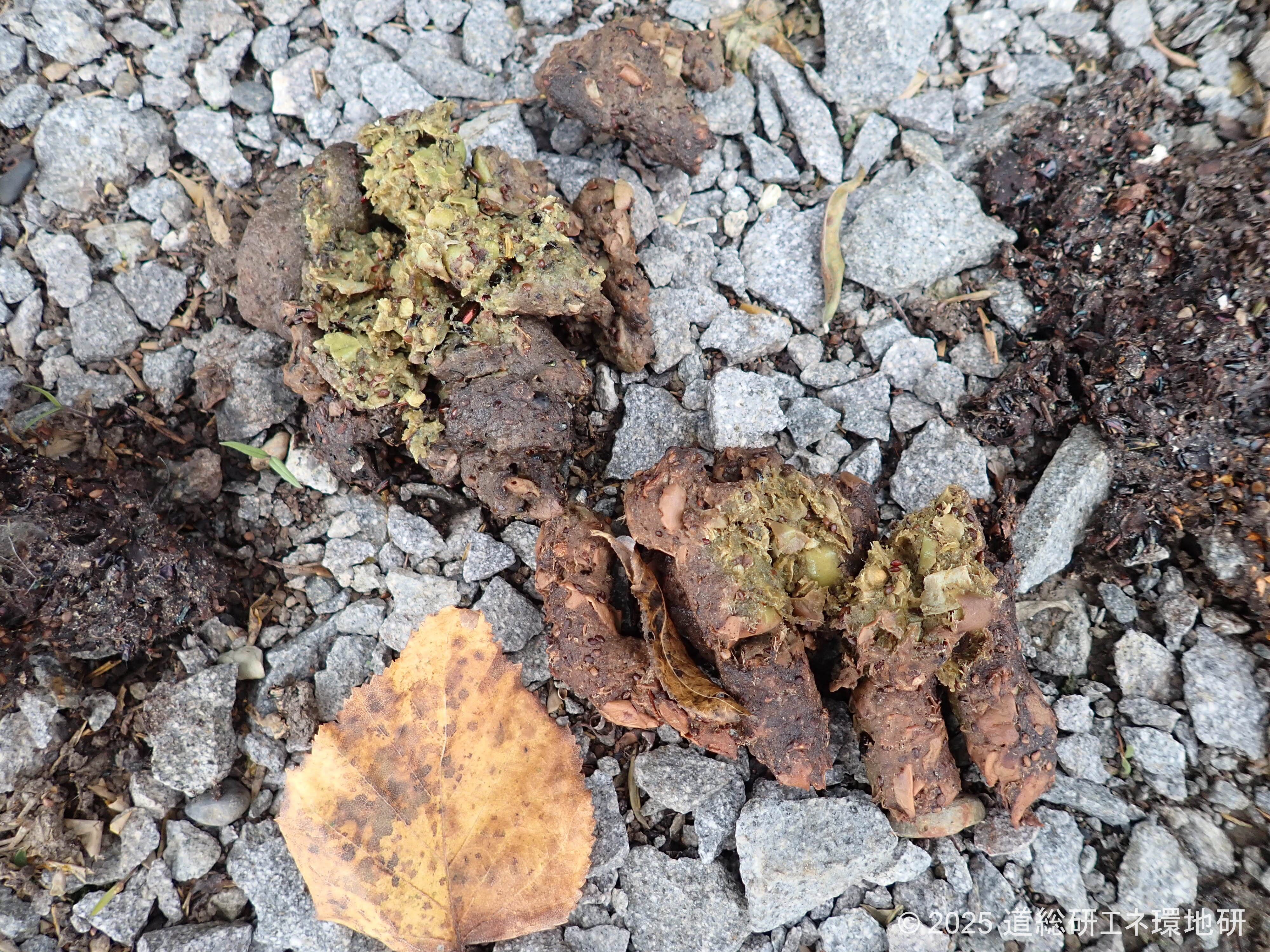 ![]() ヒグマ 痕跡 糞 クルミ1 | ![]() ヒグマ 痕跡 糞 クルミ2 | ![]() ヒグマ 痕跡 食痕 アキタブキ |