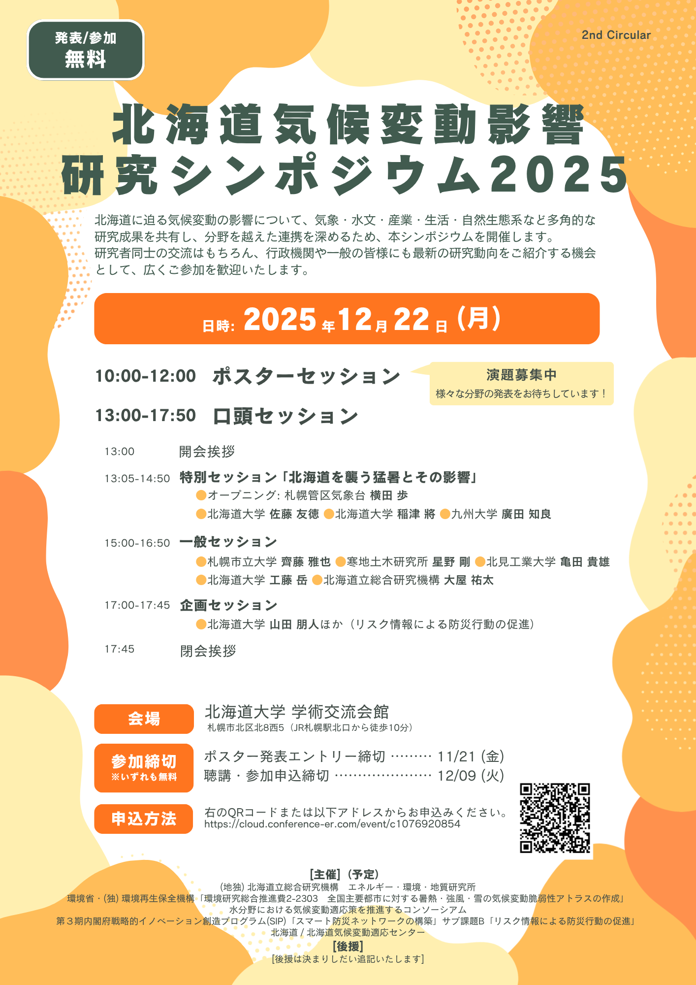 https://cloud.conference-er.com/event/c1076920854 - 主催: (地独)北海道立総合研究機構 エネルギー・環境・地質研究所、環境省・(独)環境再生保全機構「環境研究総合推進費2-2303 全国主要都市に対する暑熱・強風・雪の気候変動脆弱性アトラスの作成」、水分野における気候変動適応策を推進するコンソーシアム、SIP第3期課題「「スマート防災ネットワークの構築」サブ課題B「リスク情報による防災行動の促進」」、北海道 / 北海道気候変動適応センター