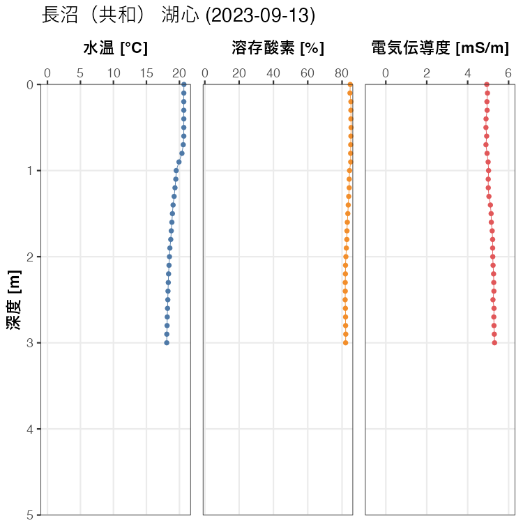 2023年9月の水質鉛直プロファイルは水深1 mでわずかに水温が低下したが全層ほぼ均一な状況だった。