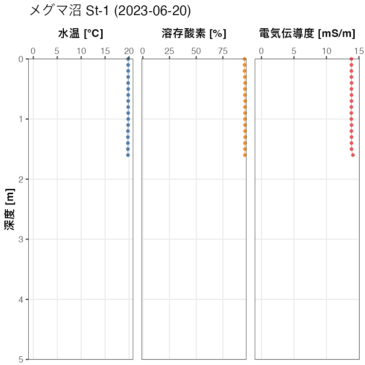 2023年6月の水質鉛直プロファイルでは水温、溶存酸素、電気伝導度とも鉛直方向に一様であった。