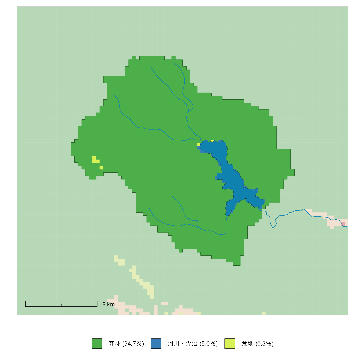 集水域の土地利用は、森林が全体の約95%を占め、エゾマツ、トドマツ、ミズナラなどを中心とした自然植生が広がる [3]。また、河川沿いにはハルニレやヤチダモなどの渓畔林が、湖岸の一部にはヨシなどの湿原植生が分布する [3]。